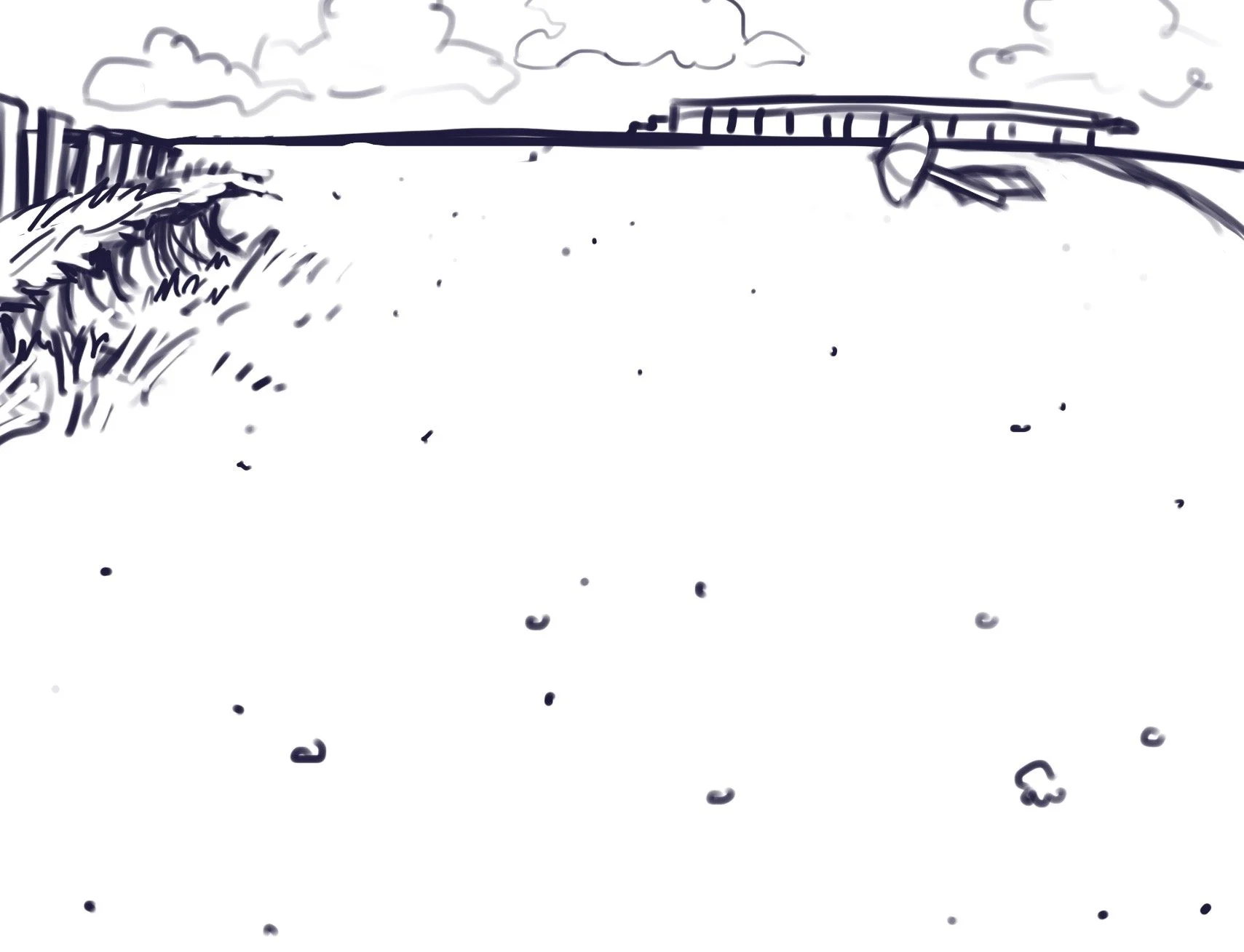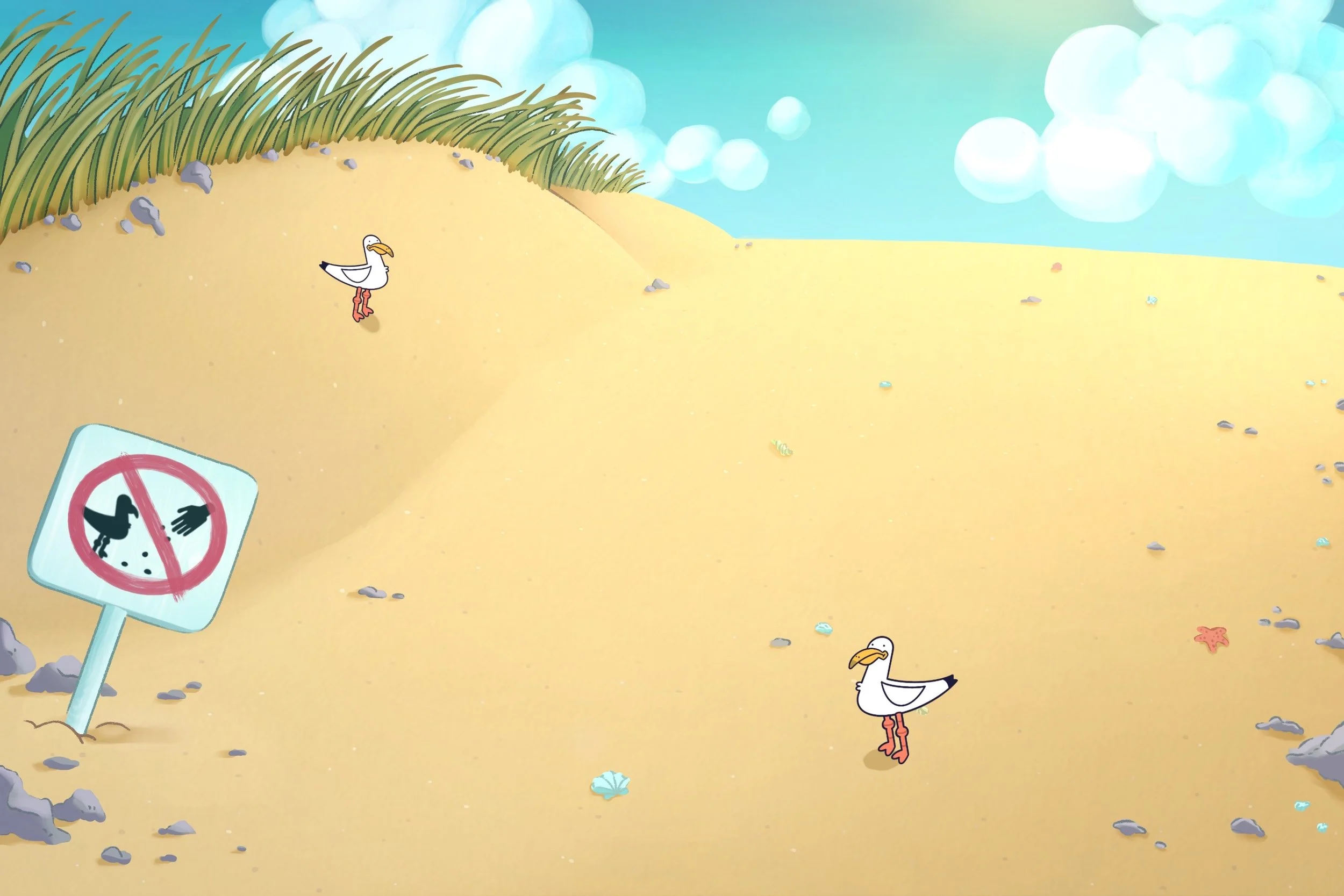 Driftwood and empty bottles litter the beach and get in the way of running seagulls. Leftover pieces of bread reward the fastest scavengers with extra points.